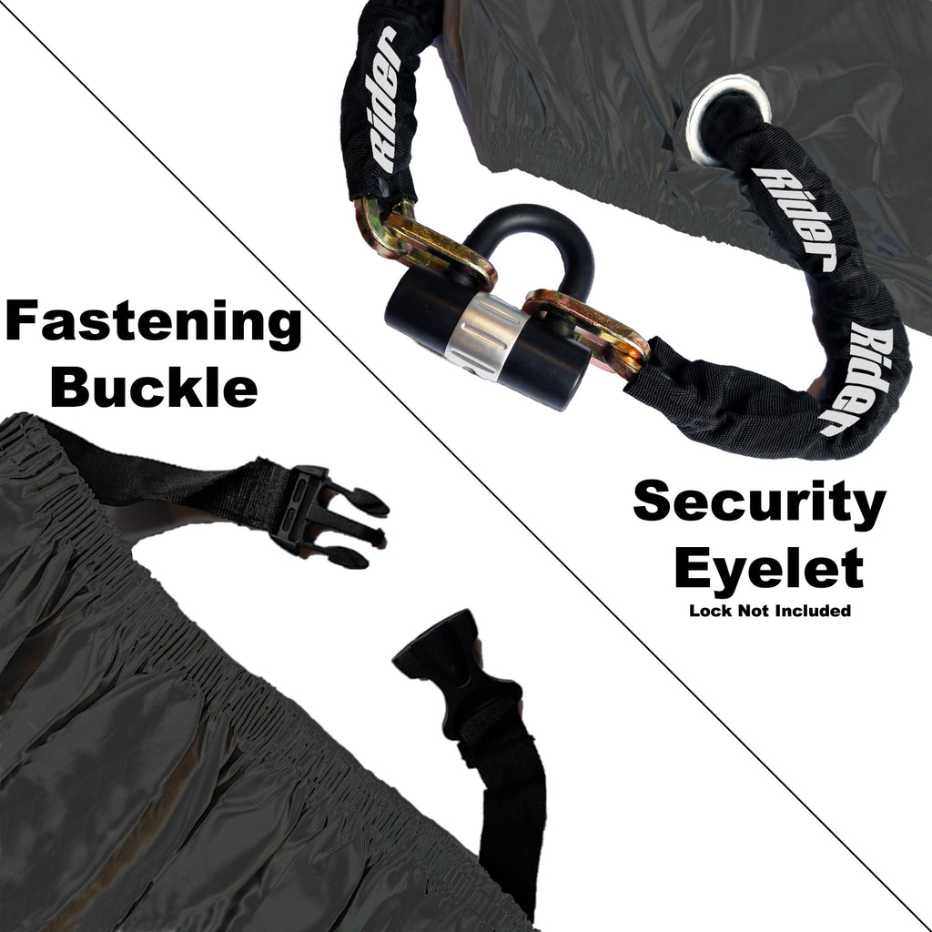 • Features a buckle strap at the bottom rear of the cover, to secure the cover underneath at the rear wheel.